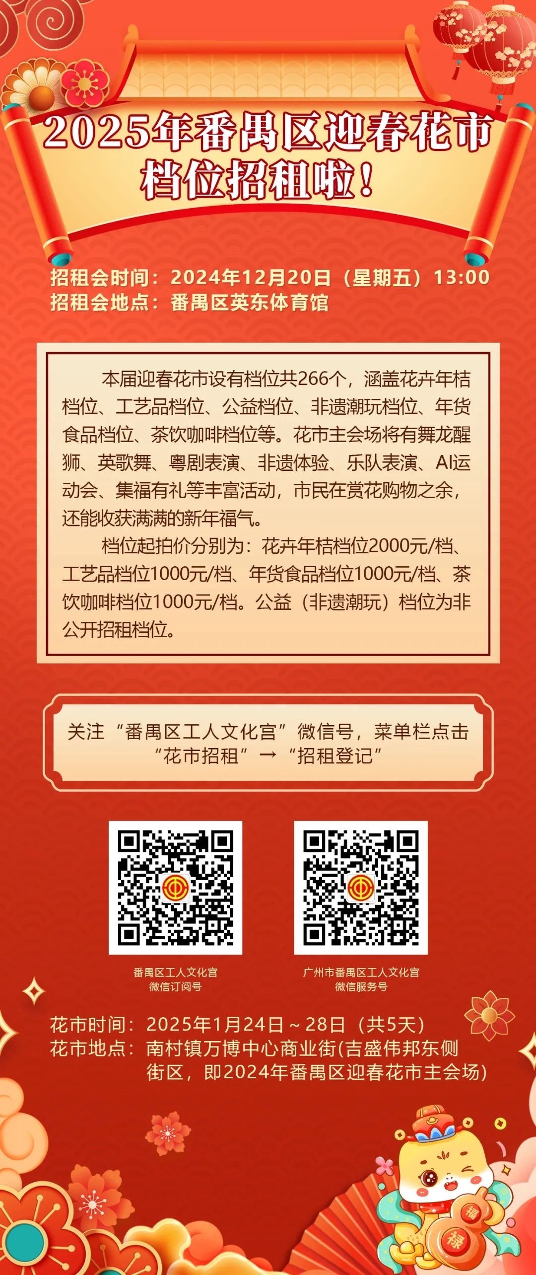 其中,花卉年桔档位、工艺品档位、年货食品档位、茶饮咖啡档位为招租档位,以公开招租方式进行竞投,公益(非遗潮玩)档位为非公开招租档位。招租时间为2024年12月20日(星期五)13:00,地点为番禺区英东体育馆(市桥街繁华路106号)。