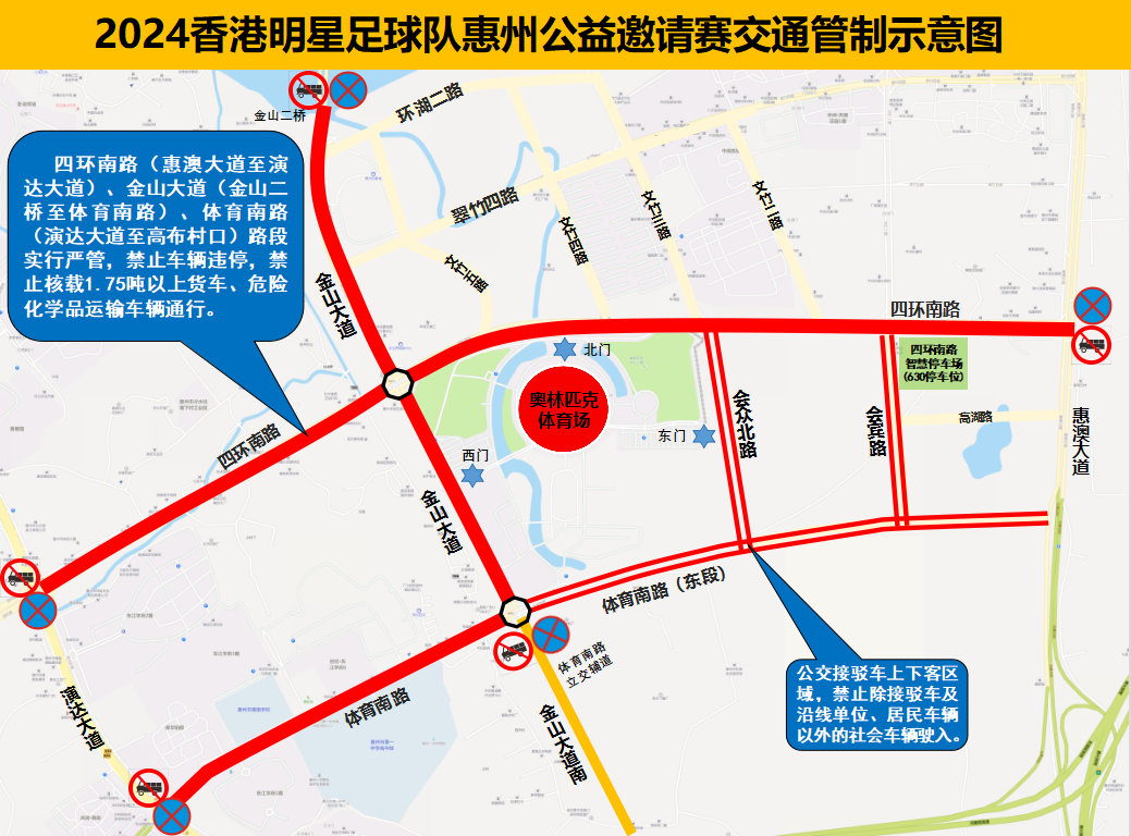 12月15日(星期日),惠州市奥林匹克体育场举办2024香港明星足球队惠州公益邀请赛。为做好比赛期间的交通安全保障工作,根据《中华人民共和国道路交通安全法》的有关规定,对惠州市惠城区部分道路实施临时交通管制,现通告如下: