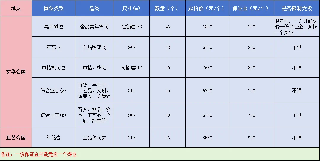 需要注意的是,本次摊位采用公开竞投方式,价高者得,所有竞投拍卖的摊位一律禁止用作经营摆卖现场制作或加工生熟食物。竞投者为企业法人,需持有效营业执照、法人代表证明书、法人代表身份证原件及复印件(盖公章);竞投者为个体经营者,须持有效营业执照和本人居民身份证原件及复印件;竞投者为个人,须持有本人居民身份证原件及复印件。此外,竞投者参与投拍时,要严格对照自己的经营项目与花市划分的经营项目是否相符,不得超范围经营。本次竞投不接受经营烧烤、无包装熟食。