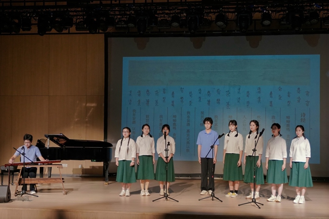 由博雅学院同学带来的吟唱节目《诗经·鹿鸣》拉开了晚会序幕。作为一首宴饮诗,以鹿鸣起兴,寓意嘉宾欢聚,展现了古人的热情与雅致,带领观众 “穿越”回先秦时代,感受“风”“雅”“颂”的独特魅力。