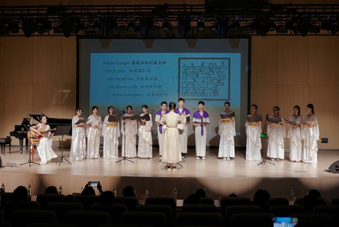 回应着中国上古音乐的鹿鸣之“兴”,博雅学院同学登台演绎一段古希腊语唱曲,古韵今声共话经典。随后,来自不同院系的师生以粤语、希腊语、拉丁语、意大利语等多种语言吟唱经典,用古筝、琵琶、小提琴、二胡、箫等器乐俯奏古曲——卡图卢斯《Vivimus》、但丁《神曲》、《春江花月夜》、《红楼梦》里的《葬花吟》、粤曲《昭君出塞》……