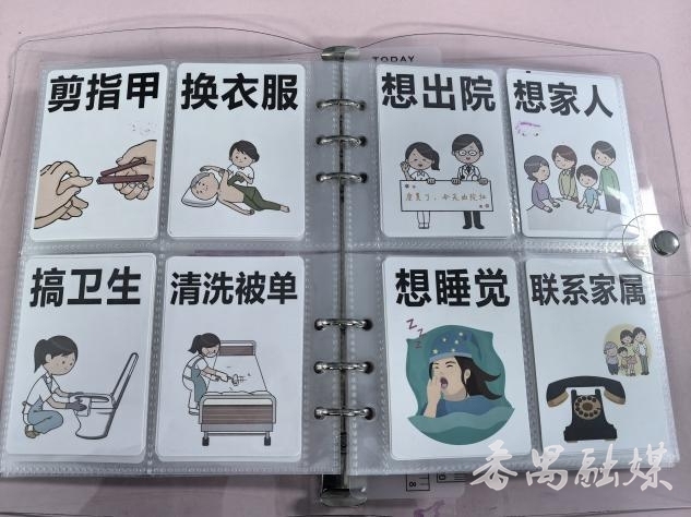 在ICU有这样一群特殊的患者,他们因疾病、治疗等需要而引起失语,无法向医护人员表达自己的需求。面对这些患者,该院ICU护理人员制作了护患沟通手册。这些护患沟通手册里每一页都是一幅卡通画,内容包括患者的常见需求,包括“我渴了”“睡不着”“我冷”“想大便”等。同时备有写字板,为语言交流障碍患者提供无障碍沟通服务。患者有需求时只需眨眼或点头示意,护理人员就可以准确及时地帮助患者解决问题。
