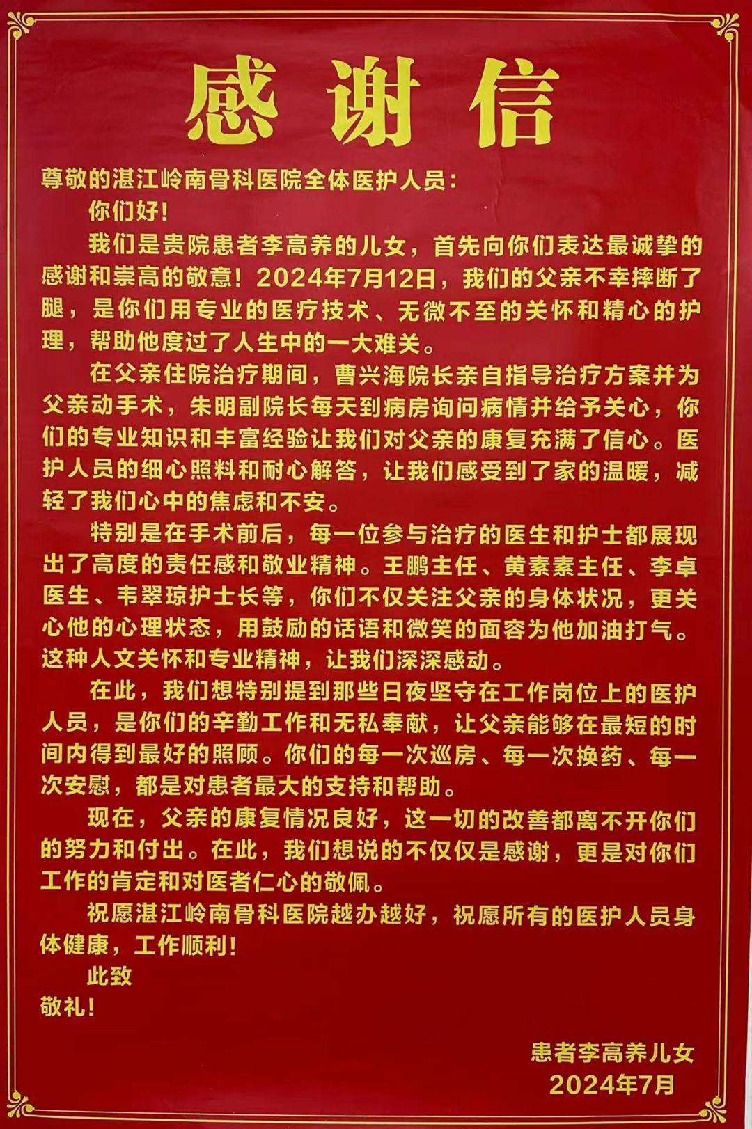 日前,李老伯还特地委托家人将精心喷印的大红感谢信送到岭南骨科医院,对该院在其先后3次入院诊疗康复过程中的精心诊治和无微不至的康复护理,表达深深谢意!