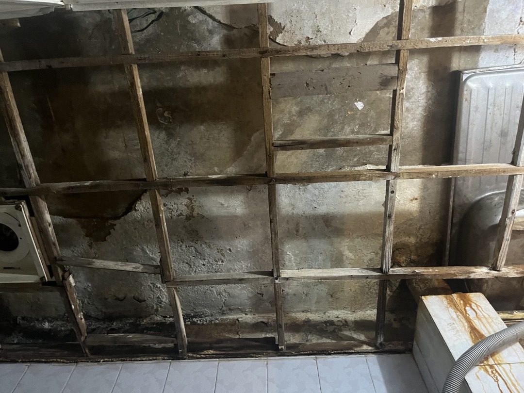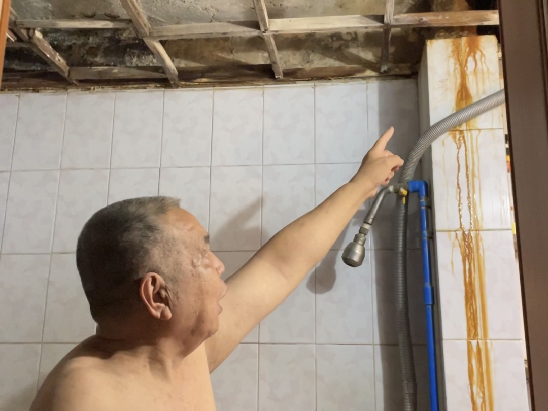 除了要忍受怪味,渗水导致的天花板批荡掉落也让吴伯整天提心吊胆。记者注意到,由于渗水问题多年未根治,吴伯家厕所的天花板批荡已经快掉完了,还有几块斑驳的天花板碎片随时可能往下掉落。吴伯说,现在他每次上厕所都要小心翼翼,生怕头顶上的批荡掉下来砸到他。“本来我今年打算对房子进行装修,但装修师傅说墙壁还在渗水没办法装修。”