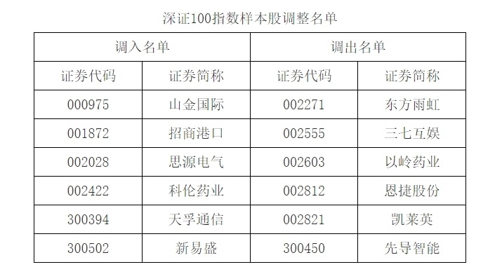 深证100指数样本股则调入山金国际、招商港口、思源电气、科伦药业、天孚通信、新易盛,调出东方雨虹、三七互娱、以岭药业、恩捷股份、凯莱英、先导智能等。