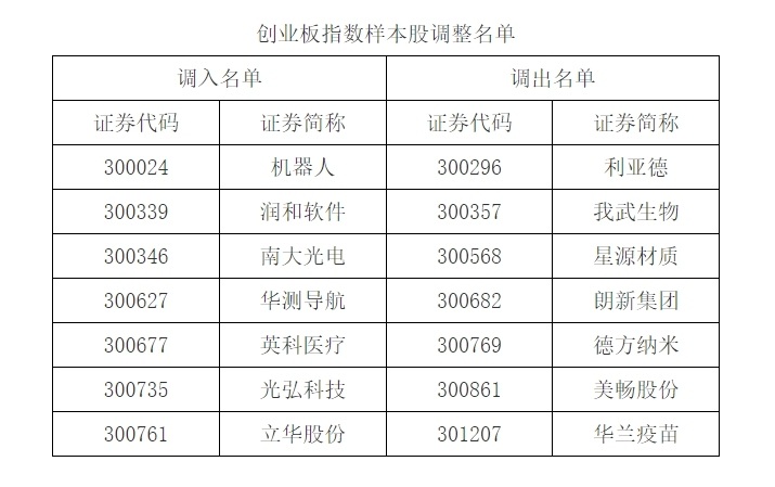 创业板指数样本股调入机器人、润和软件、南大光电、华测导航、英科医疗、光弘科技、立华股份,调出利亚德、我武生物、星源材质、朗新集团、德方纳米、美畅股份、华兰疫苗。