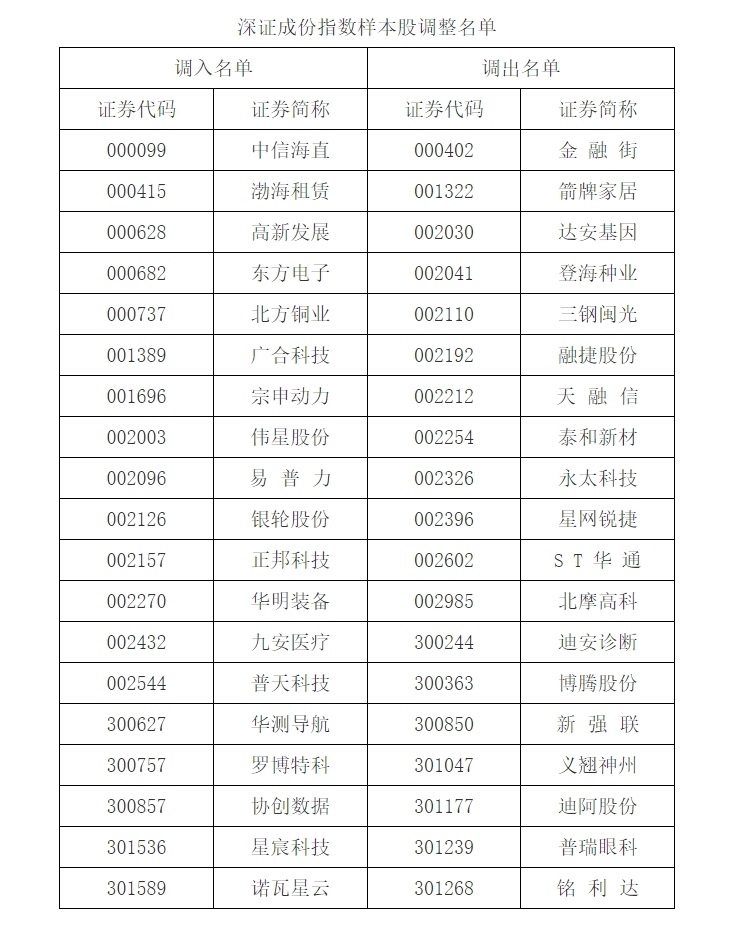 具体来看,深证成份指数样本股调入中信海直、渤海租赁、高新发展、东方电子、北方铜业等个股,调出金融街、箭牌家居、达安基因、登海种业、三钢闽光等个股。