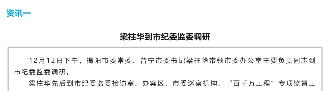 据普宁发布消息:12月12日下午,揭阳市委常委、普宁市委书记梁柱华带领市委办公室主要负责同志到市纪委监委调研。