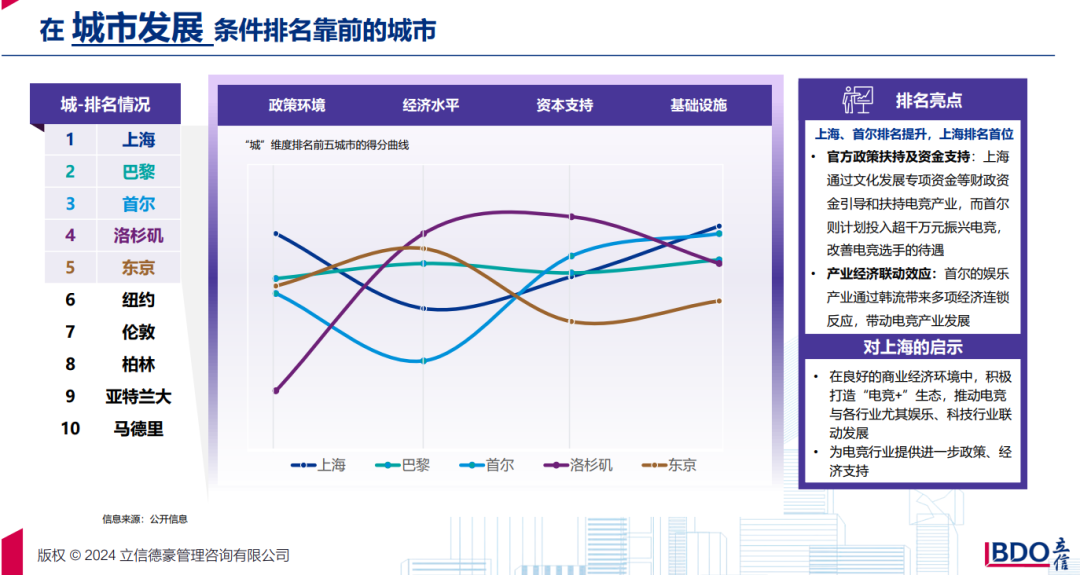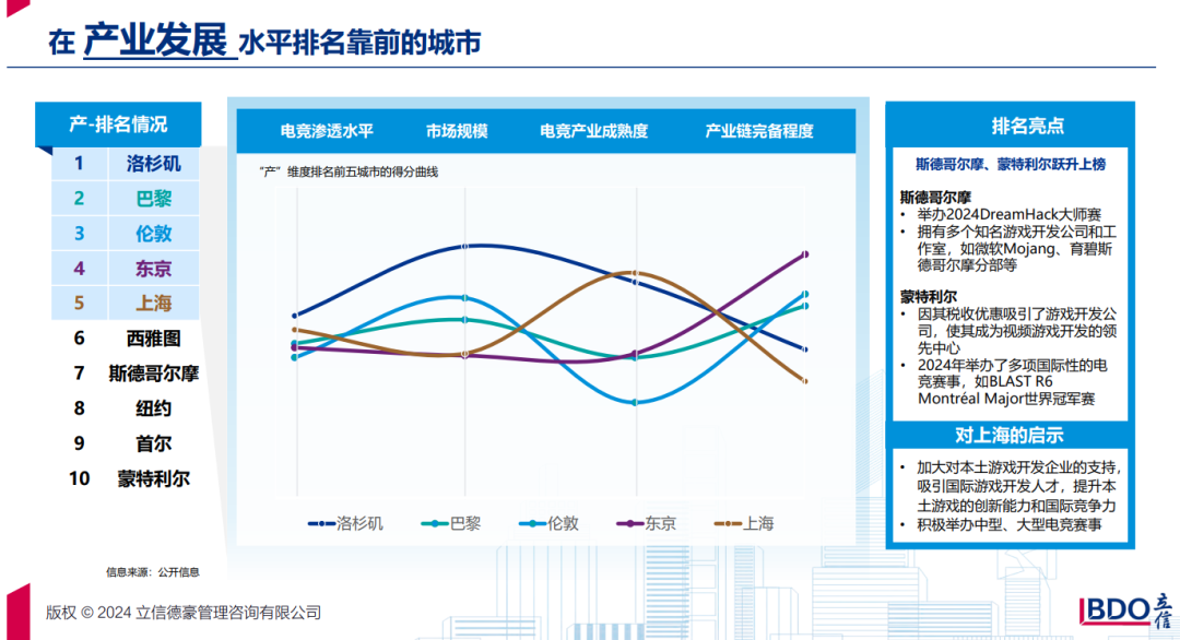 12月14日,在上海普陀区举行的第五届电竞上海全民锦标赛总决赛上,立信咨询合伙人胡旭峰在现场发布并解读了《2024全球著名电竞城市产业发展指数排名报告》。在此次发布的2024年全球著名电竞城市排名中,洛杉矶、上海、巴黎位列前三。其中,上海作为中国电竞的领军城市,不仅成功举办了数量最多的电竞赛事,也汇聚了最多的电竞俱乐部,展现了在电竞领域的强大吸引力和影响力。