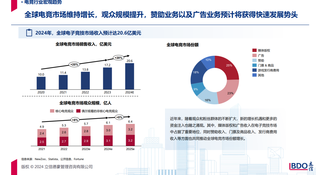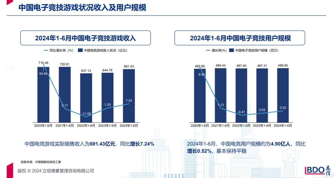 报告指出,国内电竞市场持续扩大,用户规模不断攀升。在2024年上半年,中国电子竞技用户规模已达到一个新高点,显示出电竞在国内的广泛影响力和深厚市场基础。同时,电竞产业也得到了各级政府的政策支持与资金扶持,多个省市和地区纷纷出台相关政策,推动电竞产业的健康成长和国际化步伐。