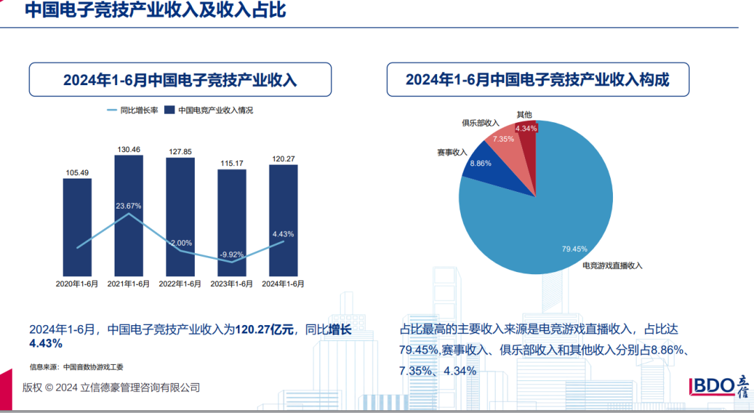 报告指出,2024年上半年,中国电子竞技产业收入为120.27亿元,同比增长4.43%。其中,电竞游戏直播收入成为主要收入来源,占比高达79.45%,赛事收入、俱乐部收入和其他收入分别占8.86%、7.35%、4.34%。2024年1-6月,中国电竞用户规模约为4.90亿人,同比增长0.52%,基本保持平稳。中国电竞游戏实际销售收入为691.43亿元,同比增长7.24%。