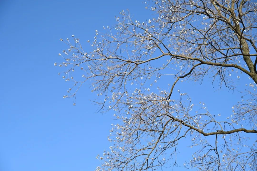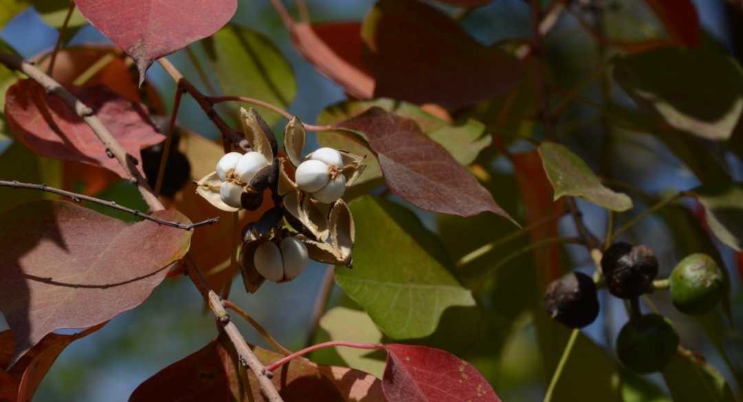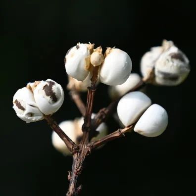 这些种子最外层包裹着白色蜡质假种皮,当分果爿完全脱落,白色的种子就完全显现出来,俏立在乌桕的枝头,远远望去像一朵朵“小白花”,正是“偶看桕树梢头白,疑是江梅小着花”。