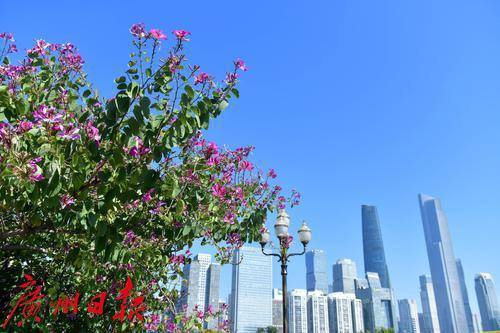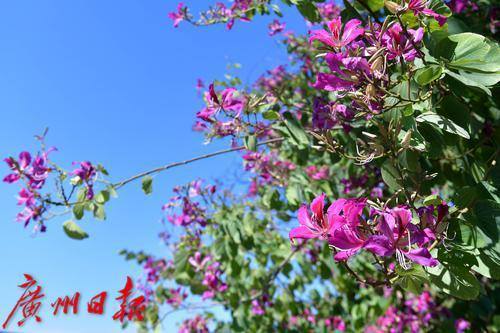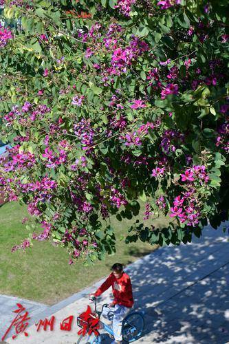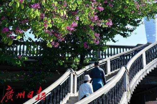广州大桥连通二沙岛的人行桥下,一排高大的宫粉紫荆随风摇曳着,粉色的花朵挂满枝头,在阳光灿烂的蓝天之下尤为好看。