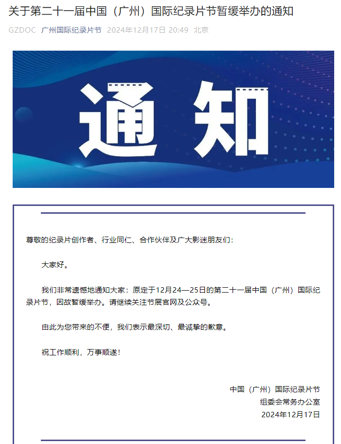 今日,广州国际纪录片节官方微信公众号发布消息:原定于12月24—25日的第二十一届中国(广州)国际纪录片节,因故暂缓举办。