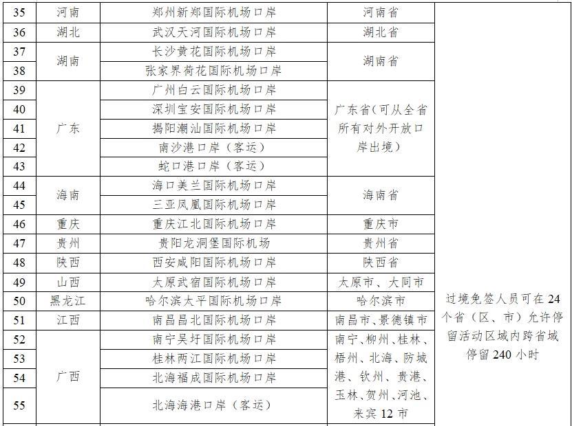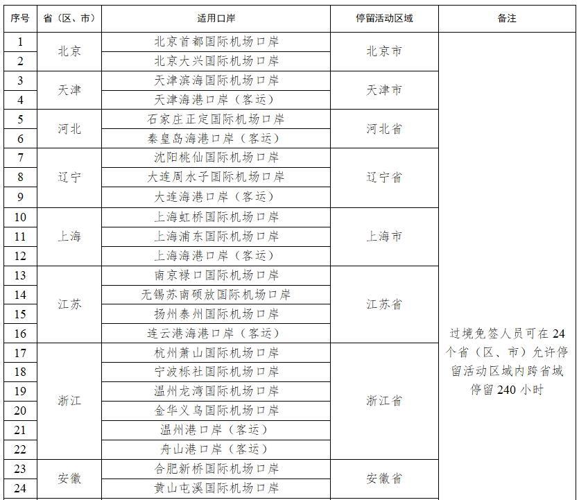 过境免签人员在安徽、海南、贵州3省停留活动区域为全省