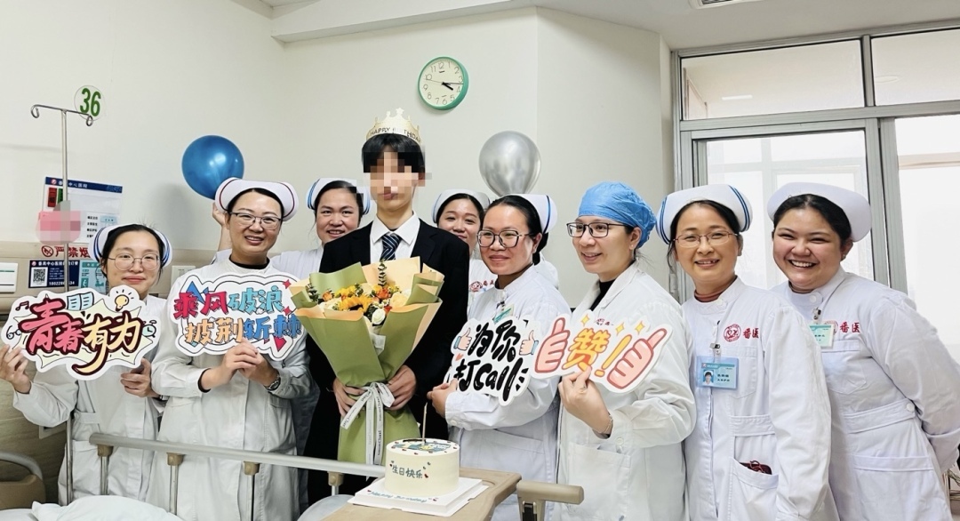 脱下病服,换上西装,青春洋溢的小华在病房里和医护人员过了一个特别的生日会。这场特别的成人礼不仅是对小华康复的庆祝,也是对他未来生活的美好祝愿。小华和他的母亲对医护人员的深情厚谊深表感激,他们表示,广医附属番禺中心医院医疗团队强大的综合救治能力给了小华第二次生命,而温暖的护理团队给了他继续前行的希望与勇气。