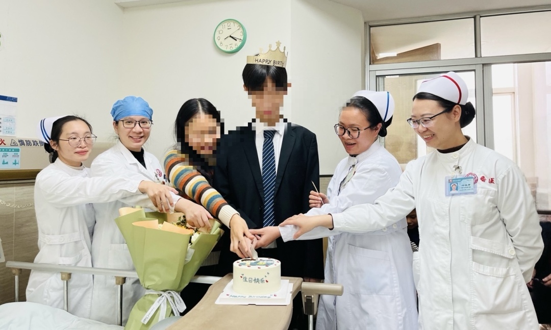 小华在医护人员的祝福下庆祝自己的十八岁生日