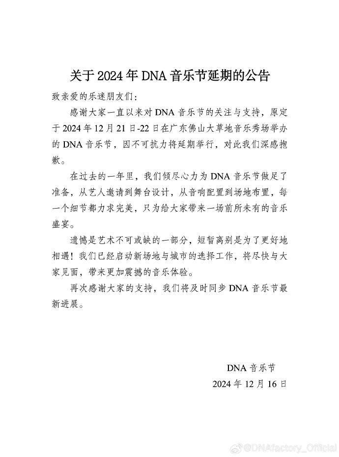 昨日下午,DNA音乐联盟官方微博@DNAfactory_Official发布公告称,原定于2024年12月21日至22日在广东佛山举行的DNA音乐节宣布延期。具体公告如下: