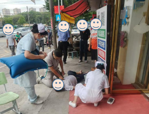 李满华快速进行体格检查,确认患者颈动脉没有搏动,呼吸停止,无生命体征后,他马上开始实施心肺复苏。同时,让旁边群众拨打120,跑去旁边的服务站通知医护人员带上急救设备过来支援。