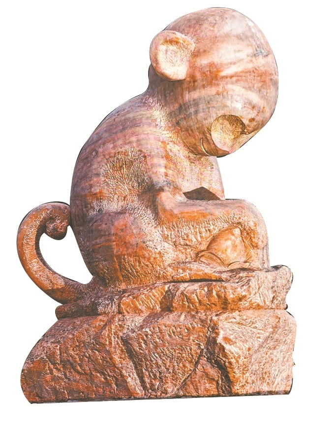 位于澳门路氹连贯公路上的《十二生肖》大型城市雕塑群是梁晚年创作的作品。图为其中一件作品《猴》。(资料图片)