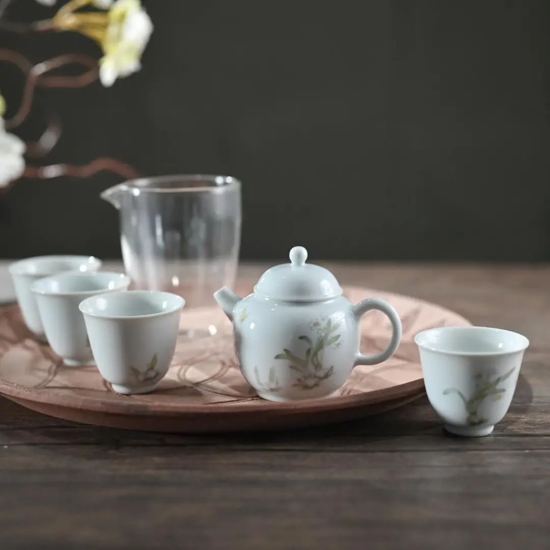 吴亚磊的另一力作《凌波仙子》系列茶具,在“2022中国精品茶具金羊奖”中摘得铜奖。凌波仙子,即水仙花。吴亚磊的《凌波仙子》系列茶具,以青白瓷为纸,以釉上色料为墨,从宋代美学中汲取灵感,结合釉上彩的特性及宋代文人画技法,再现水仙清明雅致的神韵。作品以宋人小品为师,师古而不泥古,设色淡雅,叶片修长舒朗,水仙花朵形态各异,与釉面交相辉映,相得益彰。