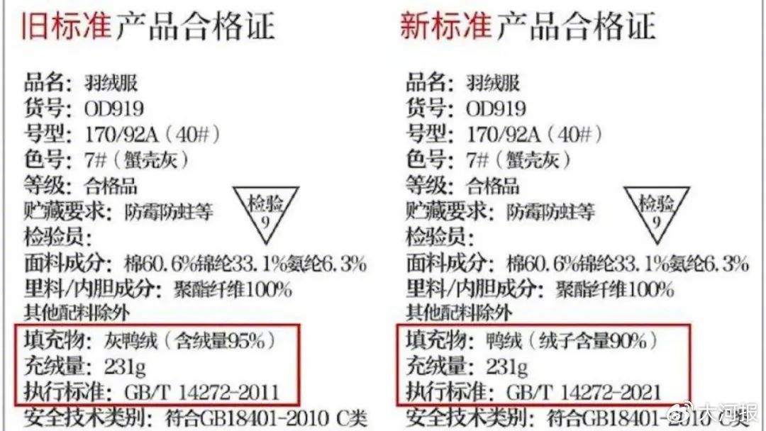 记者了解到,此前,我国羽绒服使用的旧国标《羽绒服装》以“含绒量”作为指标,绒丝、羽丝都可计入含绒量,例如90%含绒量,实际绒子含量只有81%,其余部分可用造价较低的“飞丝”找齐。
