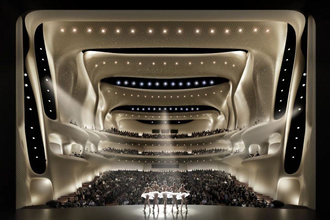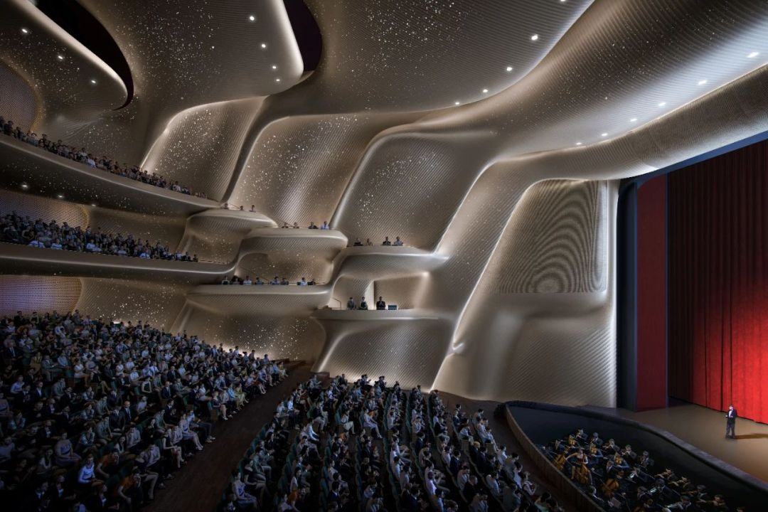 梦剧场是一个可容纳1800名观众的大型剧院。18米宽的台口,可以舒适地容纳大型歌剧、戏剧作品和完整的交响乐等大型表演。大厅和舞台将采用最先进的技术,为观众提供一个世界级的观演体验。室内天花及墙面设计一方面隐喻着层叠的波浪,与金色贝壳的外形相呼应,另外一方面也实现了极佳的声学效果,满足了梦剧场自然声演出的需求。