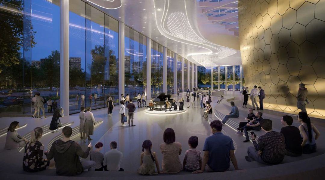 建筑入口的艺术大厅被通高的玻璃幕墙环绕,从西北角一直向南延伸至东南角,形成一个通透明亮的城市客厅,展示着金色壳体独特的形态和内外穿插的空间,让富有活力的建筑室内活动展现在公众面前,并以开放的姿态迎接着到访的公众和观演者。这里同时也是市民的舞台,无论有无演出,人们都将在此汇聚,成为建筑场所以及表演艺术中最具生命力的一部分。南面有广阔的视野,景观设计成为城市客厅室内设计的视觉延伸,外部开放性的阶梯和景观按照人流流线的方向及一定的弧度设计,同步解决了场地高差衔接的问题。