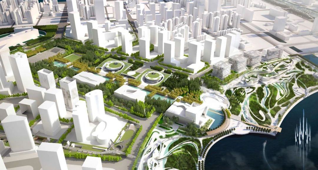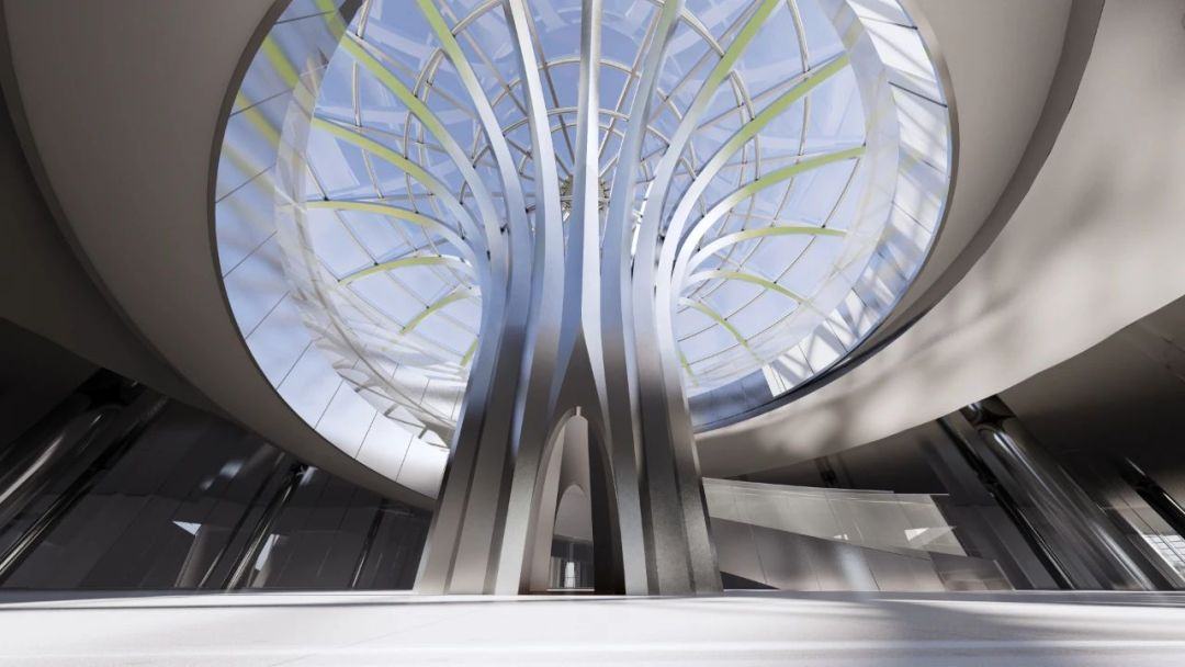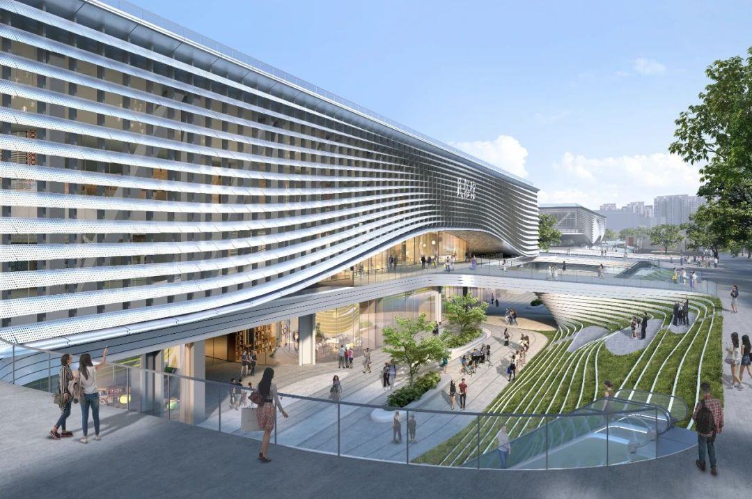 深圳书城湾区城项目在第五立面上延续城市中轴景观绿肺和生态城市定义,规划多元化生态绿地,打造城市与自然交融之地的文化核心圈;在建筑空间上延续传统岭南民俗体验和生态城市理念,敞开建筑,由外而内打造多层次生态体验路径,塑造多元化互动沉浸式文化漫步公园。项目在空间品质上纳入低碳设计理念,通过被动式设计合理优化建筑空间布局,扩大自然通风、采光、遮阳、绿化条件,辅助实现场地微气候调节、降低能耗,打造全方位人性化、舒适性人文建设环境;在造型立面上融入“玉盘”“古书卷”等中国传统符号,赋予中国风格、岭南特色的地景式文化建筑形象。