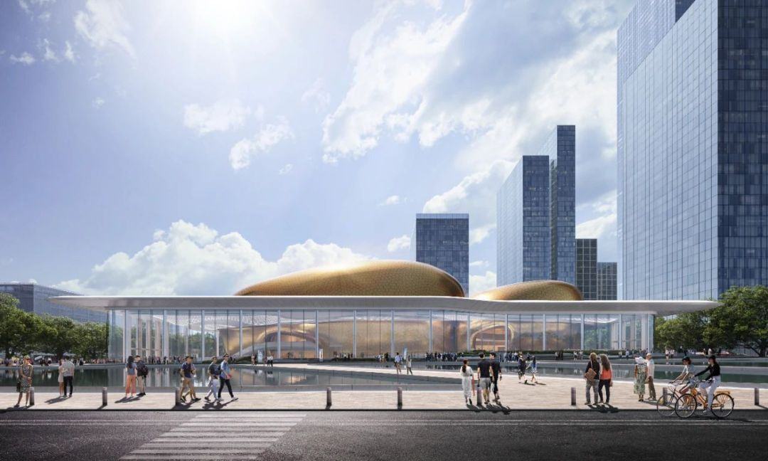 国际演艺中心项目,位于深圳福田区香蜜湖中区,坐落于山海连廊之中,总建筑面积为7.3万平方米,分为地上5层、地下4层,将成为一个极富象征意义的地标性建筑。项目由Ennead Architects LLP、亦建设计咨询(上海)有限公司和北京市建筑设计研究院设计,以“未来梦幻演艺中心”为核心理念,旨在打造世界一流的综合性表演艺术殿堂、国际文化艺术交流平台、市民向往的文化客厅和艺术打卡地。