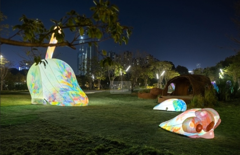 20多件艺术作品集科技创新与深刻意义于一体,不仅是视觉盛宴,更是创作者的情感表达。“95后”数字艺术家池绿山的《虚拟植物园》是属于Z世代数字美学的表达,也邀请市民朋友一同进入“数字盆景”的奇幻世界。艺术家陈锐城用作品《暗涌》观察城市的另一面。中国引领街头艺术文化的先驱之一李昱昱的蛇年限定作品《蛇蛇有钱花园》向世界传递中国式祝福的潮流文化艺术。来自中国澳门的梁蓝波与赵炎修,作品《冰·火》通过沉浸式的体验感悟数字时代水墨艺术的发展。幻鲨文化的《沐光森林》运用Mapping投影技术,为建筑墙体注入生命与灵魂。