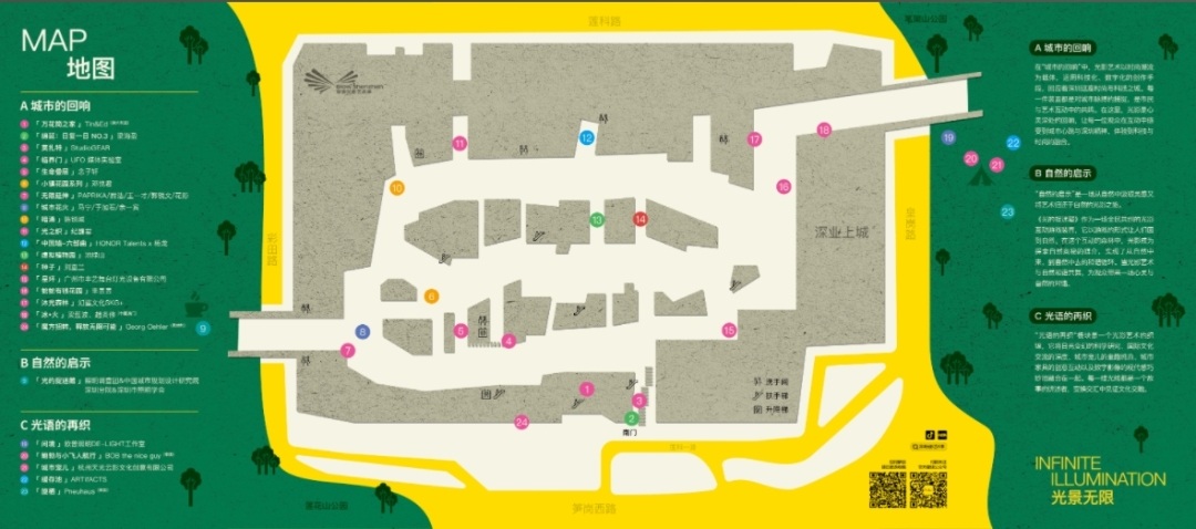 深圳光影艺术季主活动地点连续五年落户福田区,秉承光影艺术装置不仅是可观的艺术美学,更是连接人与城市的“可玩”生态体系,使艺术装置大众看得懂,乐意打卡拍照。同时注重互动性,让艺术与市民间产生联系与碰撞,为市民提供了看待艺术的新视角,不仅仅是“游客”更是“创作者”,艺术能够融入日常。为此,本届主活动地点夜游场景营造以“3+4+N”模式开展,即营造3个光影夜游场景+联动“宣文旅商”4个领域+融合N个文化社群活动。主活动地点设在深业上城及周边公园,深圳节日大道及周边商圈、深圳市当代艺术与城市规划馆为两个分活动地点。