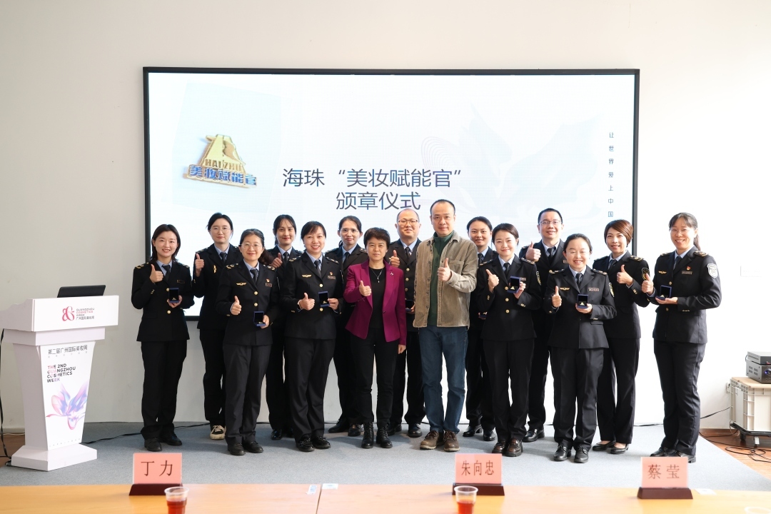 活动现场,海珠“美妆赋能官”集体亮相。广州市市场监管局副局长丁力与海珠区市场监管局局长朱向忠为首批13位海珠区美妆赋能官颁授徽章。