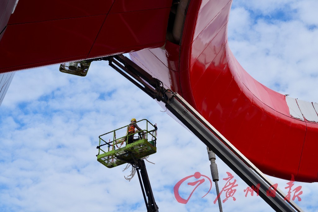 “正在进行高空作业,请注意!”工地上,身穿工作服、头戴安全帽的工人们正在有序作业。记者戴着安全帽沿着红廊行走,沿路均有安全提醒,拾级而上就来到了德胜体育中心的最高点。