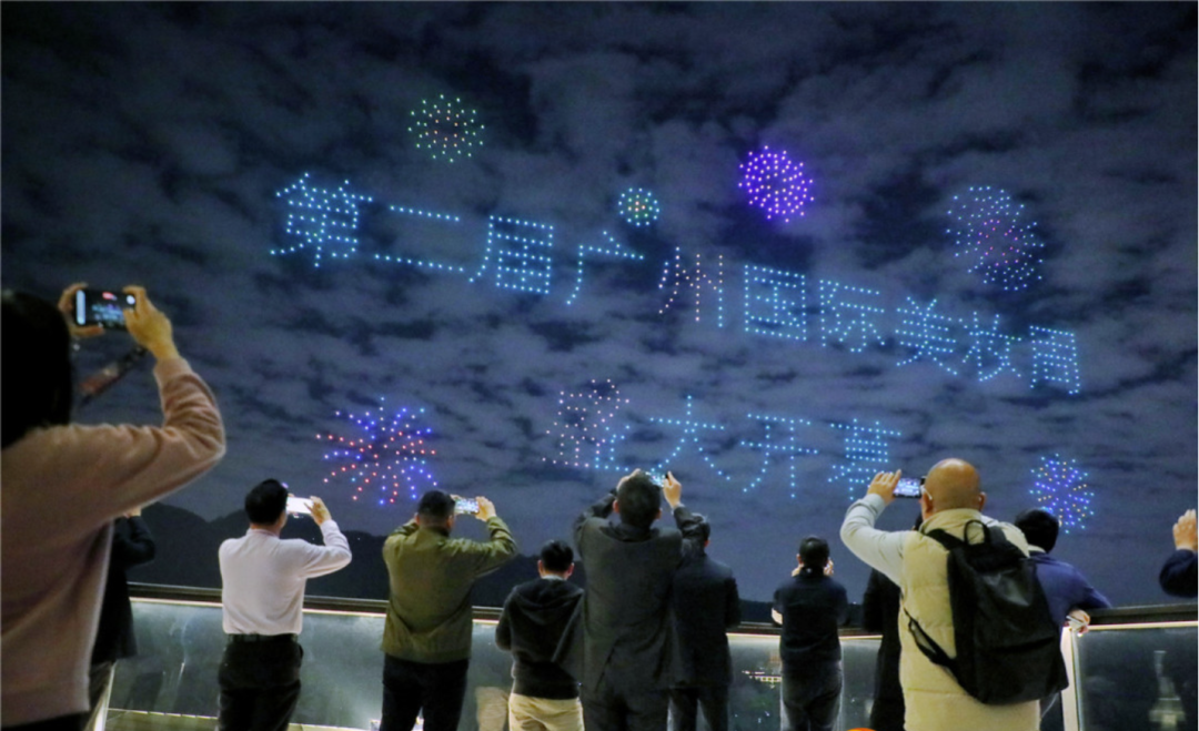 当晚,1000架无人机缓缓升空,将夜空点缀得绚烂多彩。无人机在高空中变幻出“广州国际美妆周”“第二届广州国际美妆周盛大开幕”“聚美湾区 妆点世界”“让世界爱上中国美妆”“白云美湾”等美好图景及地标图案,并展示了多家知名企业品牌形象,10余幅元素丰富的造型图案惊艳点亮白云新城上空。