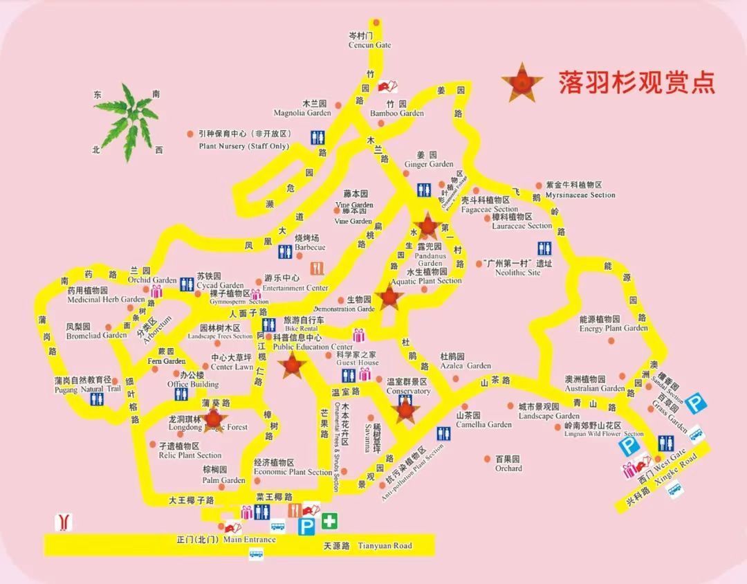 华南国家植物园黄叶、红叶观赏点:水生植物园两岸、露兜园、科普信息中心前三拱桥边、龙洞琪林、高山植物室室外、稀树草坪岸边