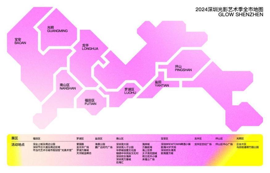 深圳光影艺术季活动期间,各区活动地点精彩纷呈,覆盖公园、广场、商圈等市民公共活动空间,展现各具特色的光影艺术新体验。