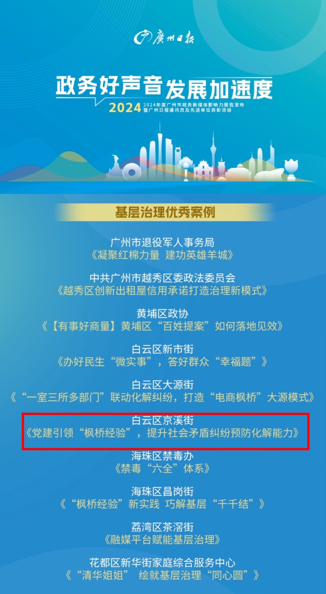 12月18日,广州日报报业集团在广州报业文化中心南塔举办“2024年度广州市政务新媒体影响力报告发布暨广州日报通讯员及先进单位表彰活动”,活动中发布《2024年度政务新媒体影响力报告》,客观评测广州市各委办局、各区的政务新媒体影响力,挖掘政务新媒体的优秀策划和传播案例。其中,白云区京溪街《党建引领“枫桥经验”,提升社会矛盾纠纷预防化解能力》荣获“基层治理优秀案例”。