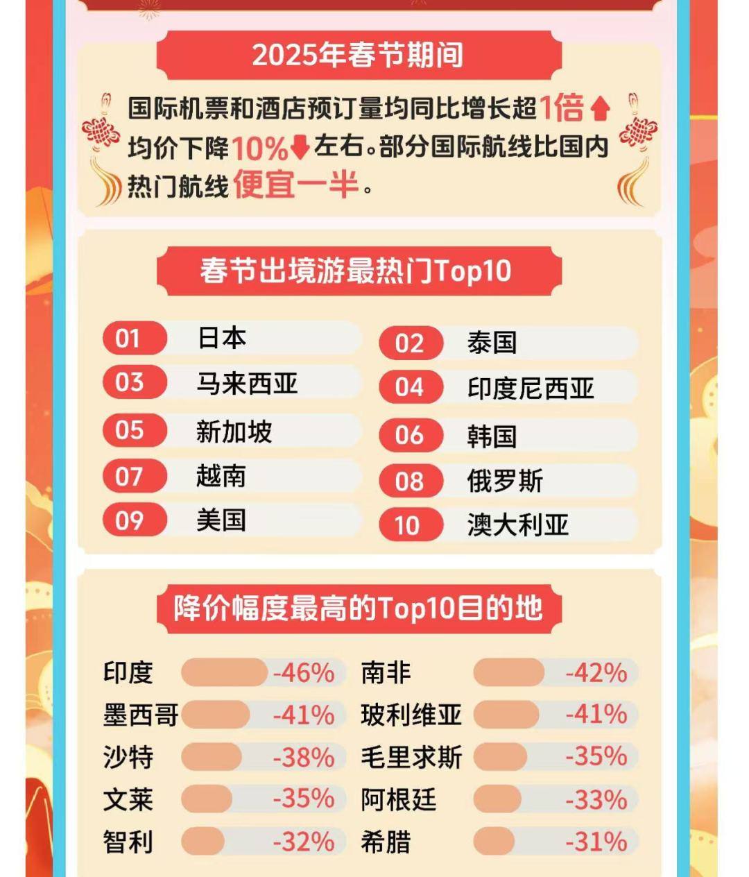 去哪儿大数据研究院分析,2025年春节有8天的长假期。如果节前请两天假,就有11天的超长假期。因此,不少人会选择错开节前节后最高峰、碎片化出行,飞行距离在4小时内的目的地最热门。