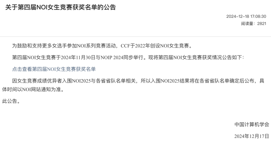 12月18日,全国青少年信息学奥林匹克竞赛官网发布第四届NOI女生竞赛获奖名单。在此次竞赛中,广东省共41人获奖,其中一等奖7人、二等奖23人、三等奖11人。