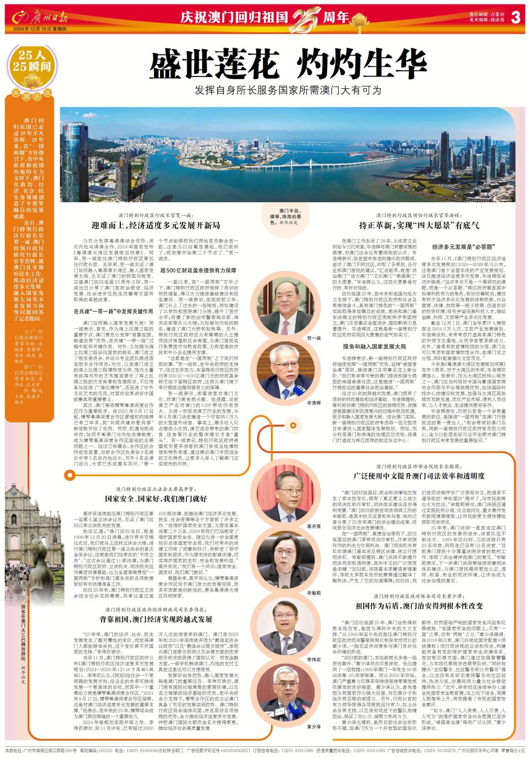 回归祖国25年,在中央和祖国内地大力支持下,澳门特别行政区政府和社会各界接续奋斗,具有澳门特色的“一国两制”实践取得举世瞩目的成就,宪法和澳门基本法确立的特别行政区宪制秩序牢固树立,澳门各项事业全面进步,国际影响力显著提升。岑浩辉说,这就是新一届特别行政区政府实现四大愿景的底气和实力。