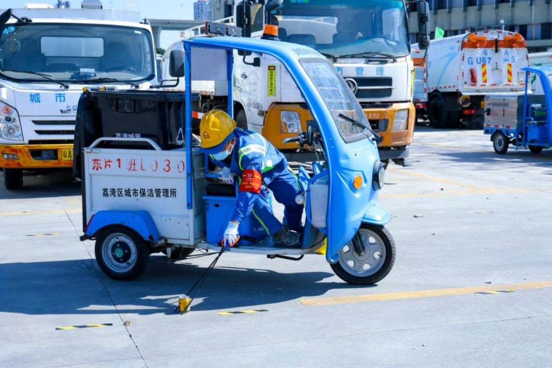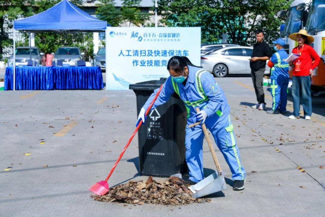 在作业技能竞赛环节,来自荔湾区各街道及区保洁所200余名环卫工人,共23支参赛队伍参加角逐。在人工清扫保洁及快速保洁车作业技能竞赛项目中,参赛选手以最快速度将2公斤的路面落叶垃圾清扫完毕,倒入垃圾桶,将工具摆放回原位;并驾驶快速保洁电瓶车行驶过一段长约30米、布满“路障”的路段,在人不下车的情况下,利用拾捡钳快速清理地面垃圾,并且不能碰倒沿路摆放的“路障”矿泉水瓶、不得倒车、脚不能触碰地面,捡拾完成后将保洁车倒车停入车库。
