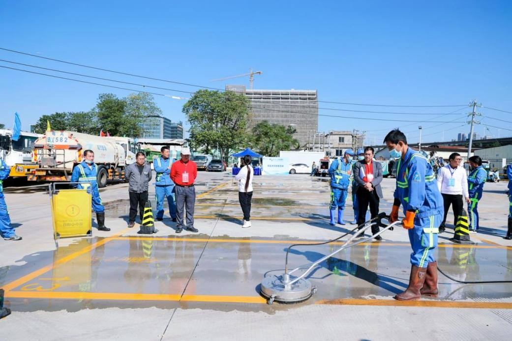 人行道机械化清洗项目考验了选手的设备操作和标准化作业能力,要求参赛选手用水枪和磨盘将人行道上的模拟污迹洗去,并对打磨后的道路进行冲洗,最后用高压水枪冲洗果皮箱,确保人行道路面干净整洁。
