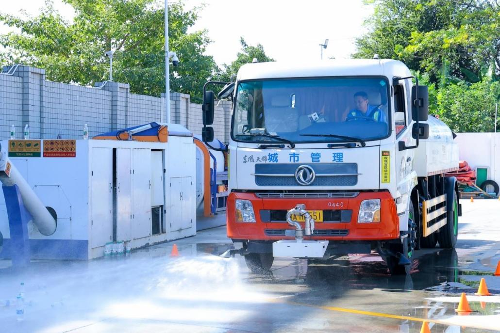 洒水车冲洗竞赛现场。通讯员供图
