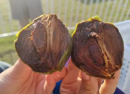 轻轻掐开,这个奇特的柿子里面竟然是黑色果肉,吃起来口感绵密,有巧克力布丁的香甜,但仍保留着柿子果肉中的“小舌头”,层次分明。除了直接食用,巧克力柿子还可以用来制作面包和甜点,确实与众不同。