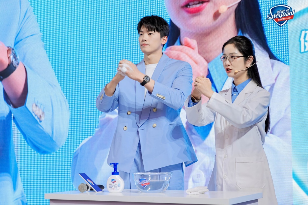 在活动现场,汪顺和宝洁科学家小慧老师带领大家学习七步洗手法,还通过胡椒粉排斥细菌实验,展示了洗手液抑菌功效;通过吹泡泡实验,展示了沐浴露绵密泡沫。