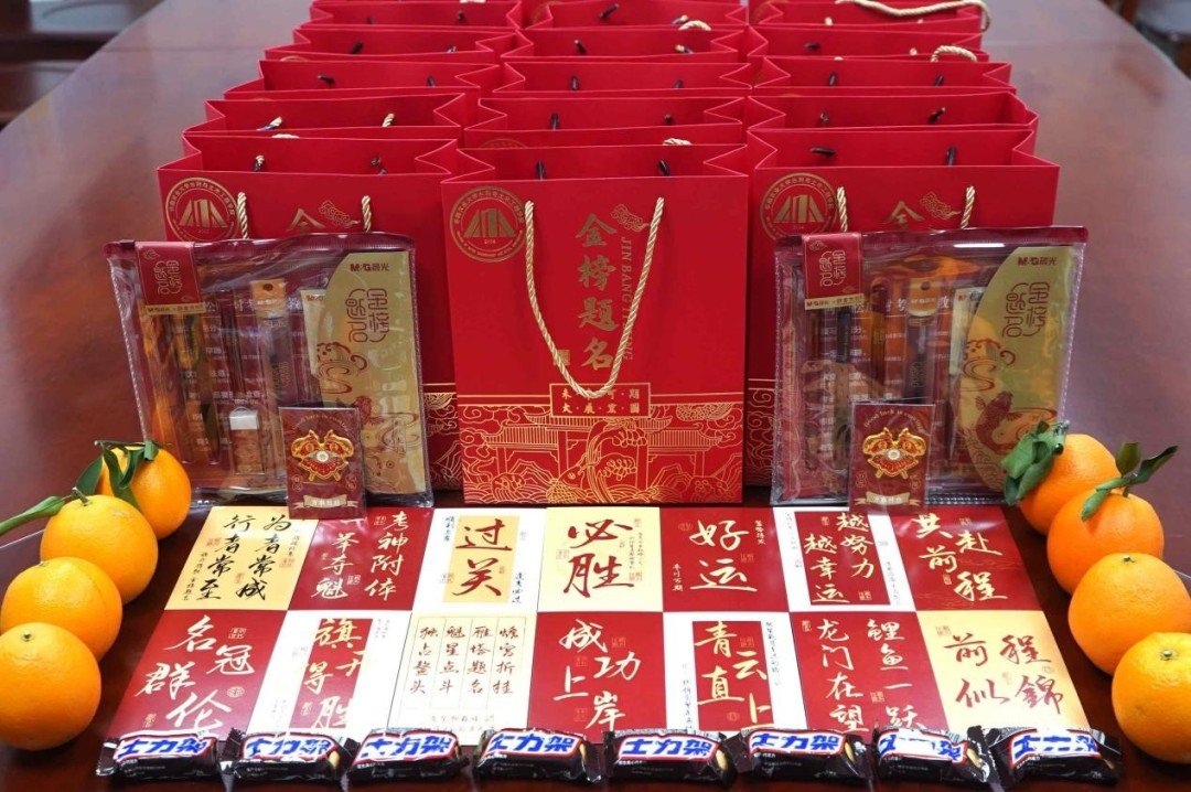 华农水利与土木工程学院送出的大礼包心意满满——加油包中有寓意旗开得胜的胸针、心想事“橙”的脐橙、考试专用文具套装、补充能量的巧克力和辅导员老师手写的祝福明信片。收到礼包的同学表示:“刚看到礼包的时候有点被惊到了,这么多有美好寓意的的小礼物,还有写着自己名字的明信片,太温暖了,紧张的情绪舒缓了很多。”