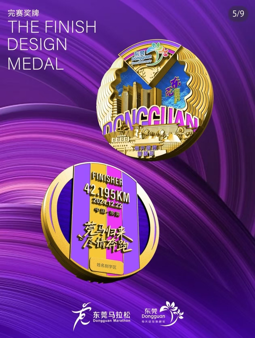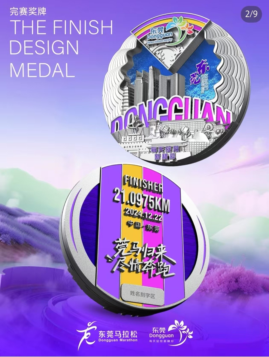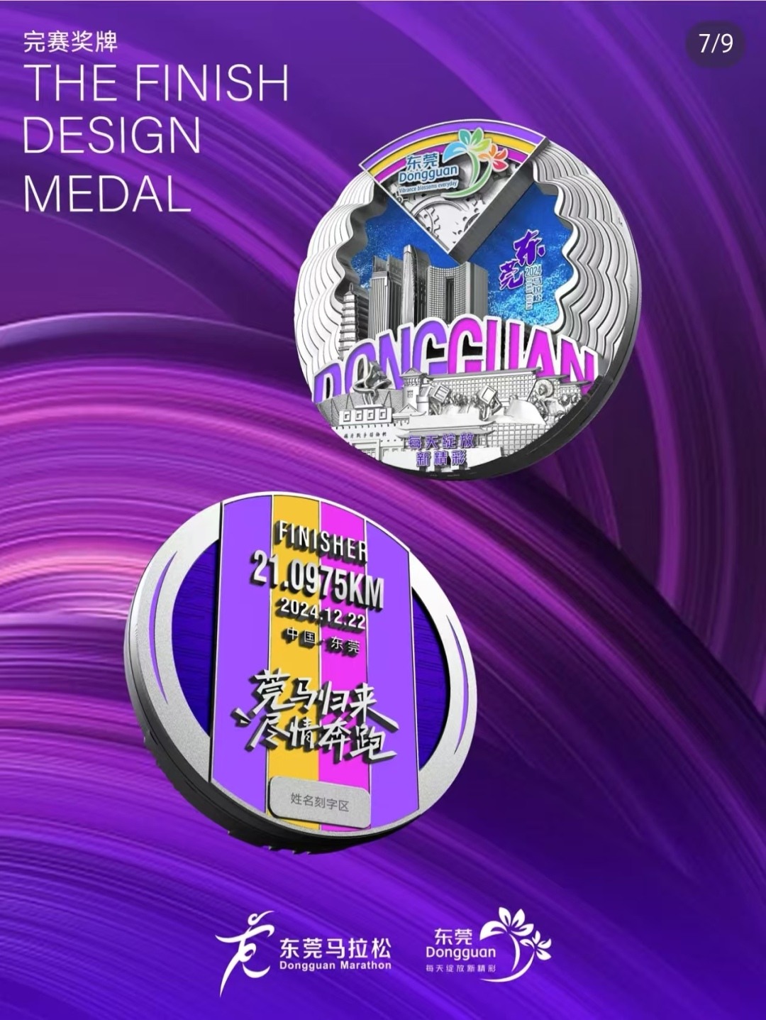 而本次的完赛奖牌设计感满满,采用独特的中间镂空流沙设计,镶嵌东莞城市地标建筑,全马、半马、欢乐跑奖牌同款不同色,三色闪耀,各绽光芒。奖牌背后精妙构思,采用名字刻字磁吸贴片设计,为参赛选手打造独特的莞马勋章。