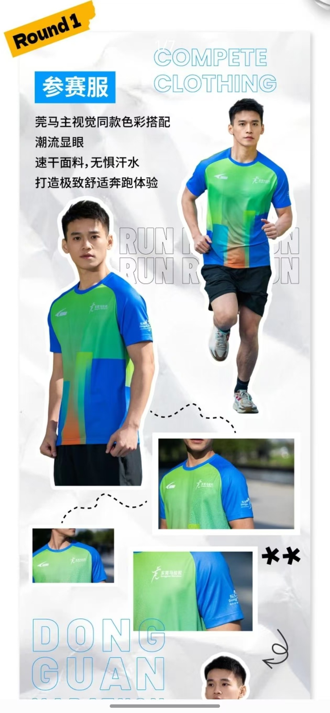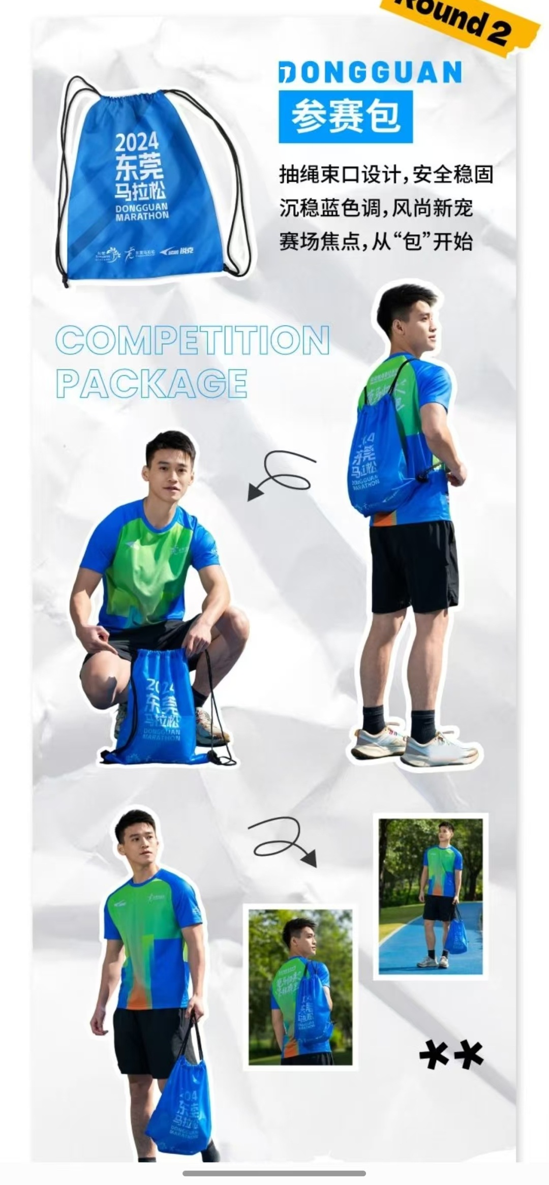 此次参赛服采用了莞马主视觉同款配色,潮流又显眼,速干的面料打造舒适的奔跑体验;参赛包的物资更是实用又贴心,其中充满东莞特色“莞小鹅”也在其中,还有限量款行李牌。