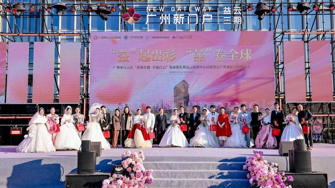 12月18日,“益起出彩·囍卷全球”集体婚礼暨白云区最美结婚登记户外颁证点授牌仪式在益云海丝中央公园举行,9对新人参与集体婚礼,推动形成文明健康、向上向善的新时代婚育新风。
